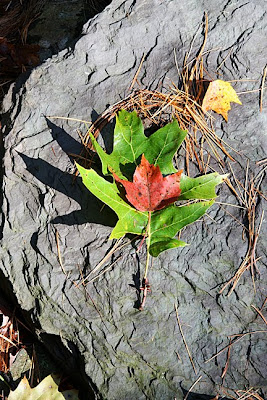 I went for a walk in the woods this morning and brought my camera. I'd been painting leaves on leaves (click here.) but wanted to actually photograph some leaves on leaves. I set myself one rule: I wouldn't take any leaf more than 50 paces from where I picked it up. I wanted to make this project reflect a very specific locality. Here are this morning's pics, unedited. (ha. I came back and edited them later.) The first one I took was the fern and the big red leaf. It's my favorite.